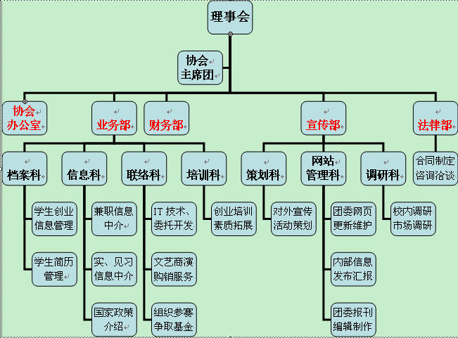在全球金融危机的背景下,目前大学生就业形势依然非常严峻,促进大学生就业创业工作已成为当前高校共青团的一项重要中心工作,也是高校共青团组织服务青年学生成长成才的一项重要举措。 为贯彻团中央下发的《关于贯彻落实共青团促进大学生就业创业工作电视电话会议有关事项的通知》,更好地服务我校大学生,为已经创业或有意愿创业的在校生提供创业支持与帮助,校团委决定成立“williamhill中国大学生创业发展协会”,立足校内,为在校生创业活动提供相关服务。 williamhill中国大学生创业发展协会是直属校团委领导下的由在校大学生自愿组织起来的群众性学生组织。在各项工作上接受校团委指导。本协会以“放眼市场、立足校园、紧跟形势、发挥特色、追求卓越”为宗旨,正式名称为“williamhill中国大学生创业发展协会”。 本协会根据校团委指导开展工作,以帮助、扶持、服务我校学生的自主创业活动为宗旨,同时联系各类企业,甄选、收集各类实习、见习、兼职、创业信息与政策,提供给广大在校学生。 本协会机构设置及说明如下:
