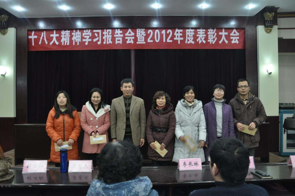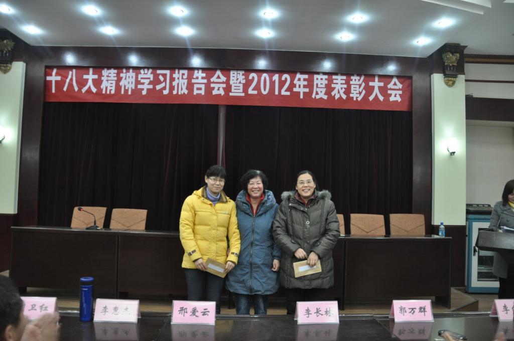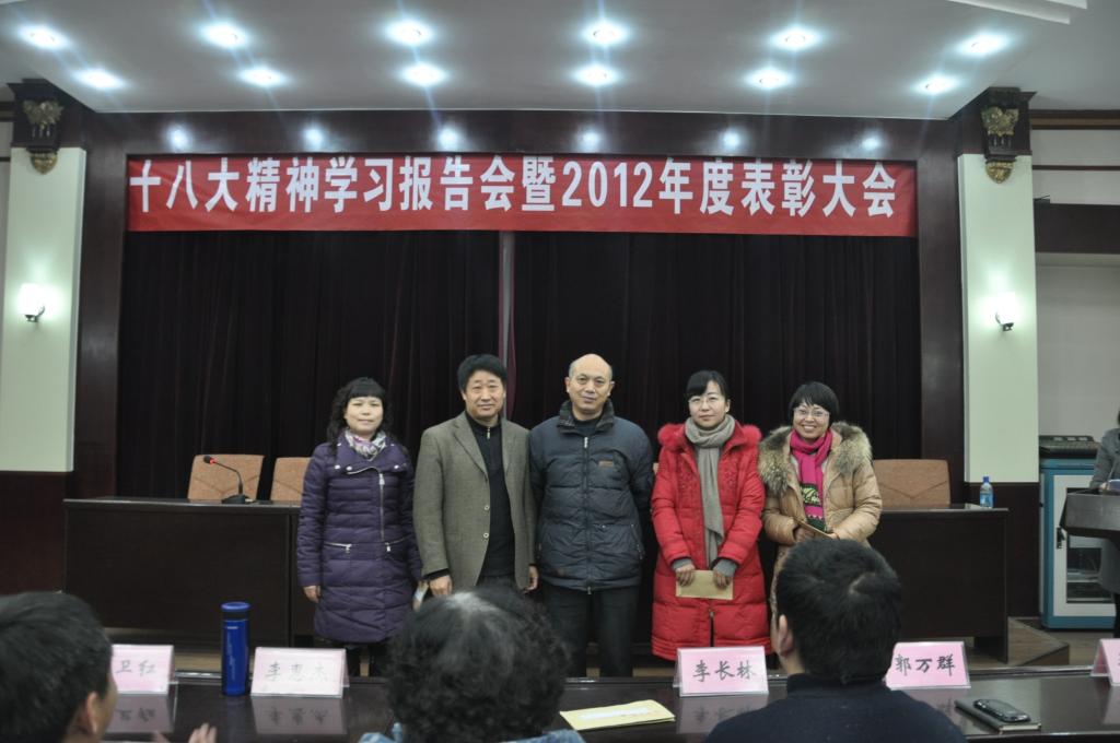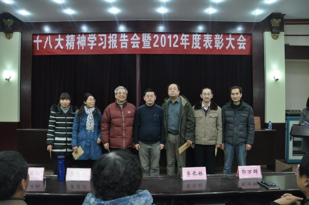 首先,总支书记李长林为我院全体职工做了学习十八大专题报告。报告题为《报告的创新与创新的报告》,李书记从指导思想,五位一体,核心价值观等十个方面对十八大精神做了深刻而具体的解读。其次,院长郭万群结合学习十八大精神就williamhill威廉希尔学科团队建设进行了总结和部署。最后副院长杨道云宣讲了本年度我院获奖的科研和教学成果名单,教务处处长李惠杰与院领导共同为获奖教师进行颁奖,