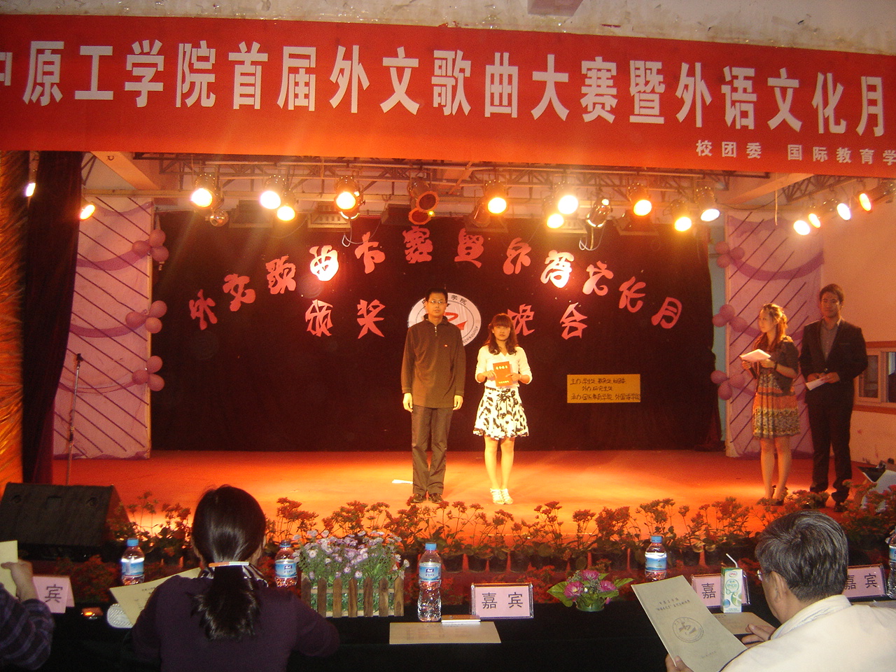 4月27日晚6点在北苑餐厅四楼举办了williamhill中国首届外文歌曲大赛暨外语文化月颁奖晚会。校学生处处长张东伟、校对外汉语交流与合作办公室主任孙玮、校教务处副处长张超、校研究生处党总支书记海松梅。校团委书记孙斌、williamhill威廉希尔院长郭万群、williamhill威廉希尔副院长杨道云、williamhill威廉希尔党总支副书记李向东、国际教育学院院长杨红英、国际教育学院党总支副书记方敬永以及特邀佳宾华南理工大学williamhill威廉希尔教授、博士生导师秦秀白。其中孙玮主任、郭万群院长、杨道云副院长、杨红英院长同时兼任本次比赛的评委,担任本次评委的还有外教Donald老师、Alastair老师。