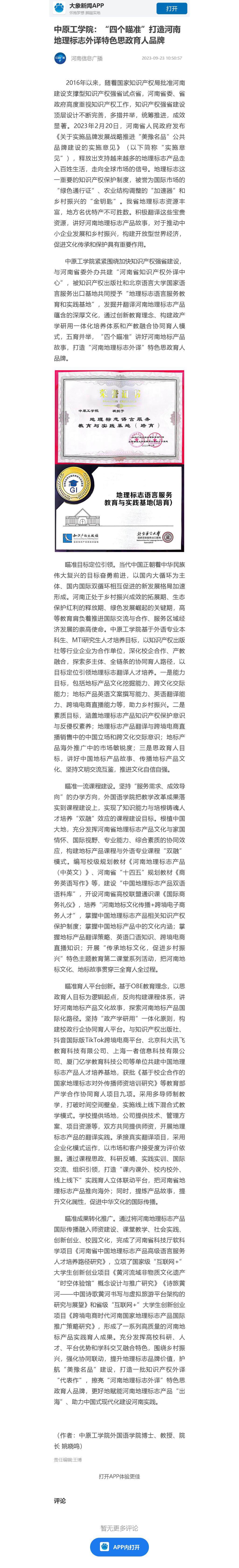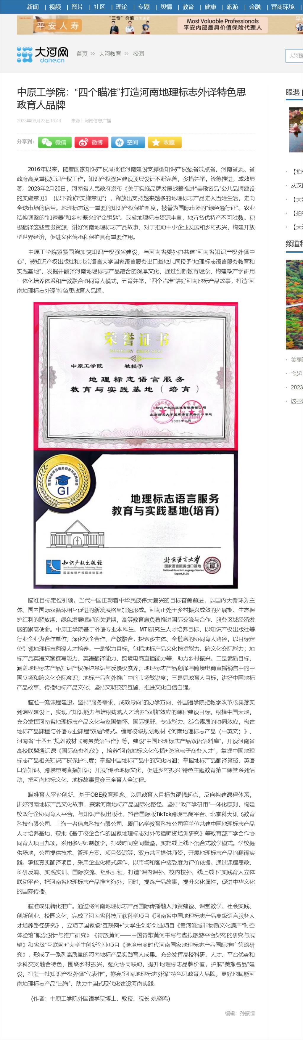 williamhill中国紧紧围绕加快知识产权强省建设,与河南省委外办共建“河南省知识产权外译中心”,被知识产权出版社和北京语言大学国家语言服务出口基地共同授予“地理标志语言服务教育和实践基地”,发掘并翻译河南地理标志产品蕴含的深厚文化,通过创新教育理念、构建政产学研用一体化培养体系和产教融合协同育人模式,五育并举,“四个瞄准”讲好河南地标产品故事,打造“河南地理标志外译”特色思政育人品牌。