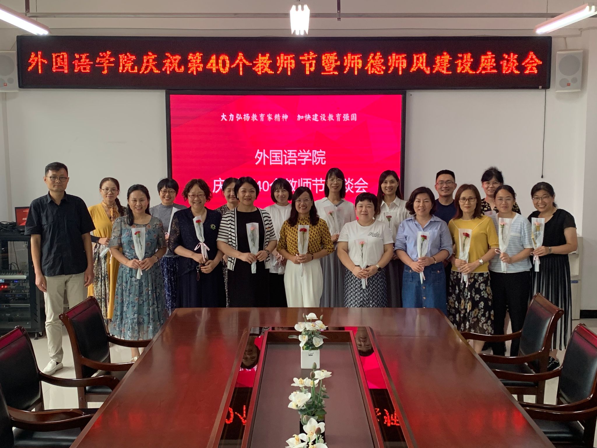 会上,学生代表向参会教师敬献鲜花并致以最诚挚的节日祝福。日语系季江静老师作为教师代表发言,分享自己多年的教师职业生涯的心路历程与感悟;2024级MTI研究生代表薛达同学作为学生代表发言,表达了对老师们诚挚的敬意与感谢。