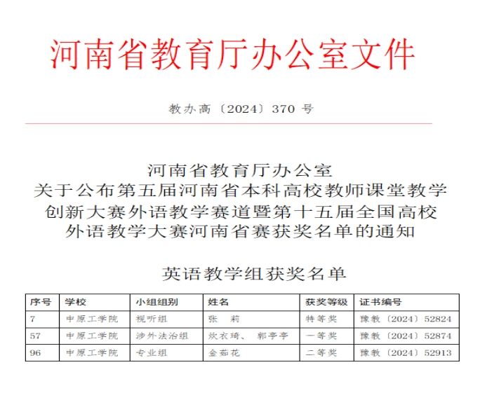 近日,河南省教育厅发布了《第五届河南省本科高校教师课堂教学创新大赛外语教学赛道暨第十五届全国高校外语教学大赛河南省赛获奖名单的通知》(教办高〔2024〕370 号)。我院教师炊衣琦、郭亭亭获英语教学组的涉外法治组河南省一等奖1项。在本届赛事中,我院荣获特等奖、一等奖、二等奖共3项。