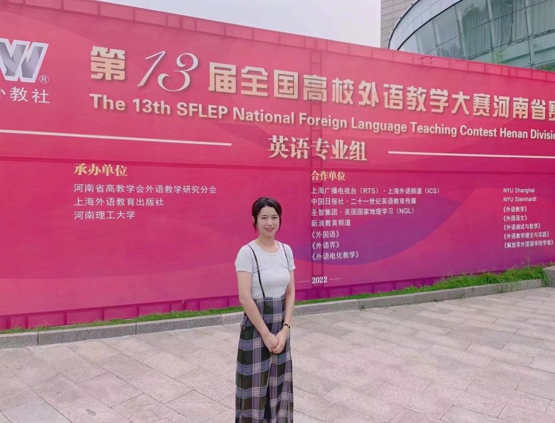 近日,第十三届全国高校外语教学大赛河南赛区本科英语专业组总决赛在河南理工大学落下帷幕,我院教师龚梦南在全省本科院校外语教师选手中脱颖而出,荣获本科英语专业组一等奖,这也是我院教师自7月中旬获本科大学英语综合组省一等奖以来再次取得省一等奖的优异成绩。