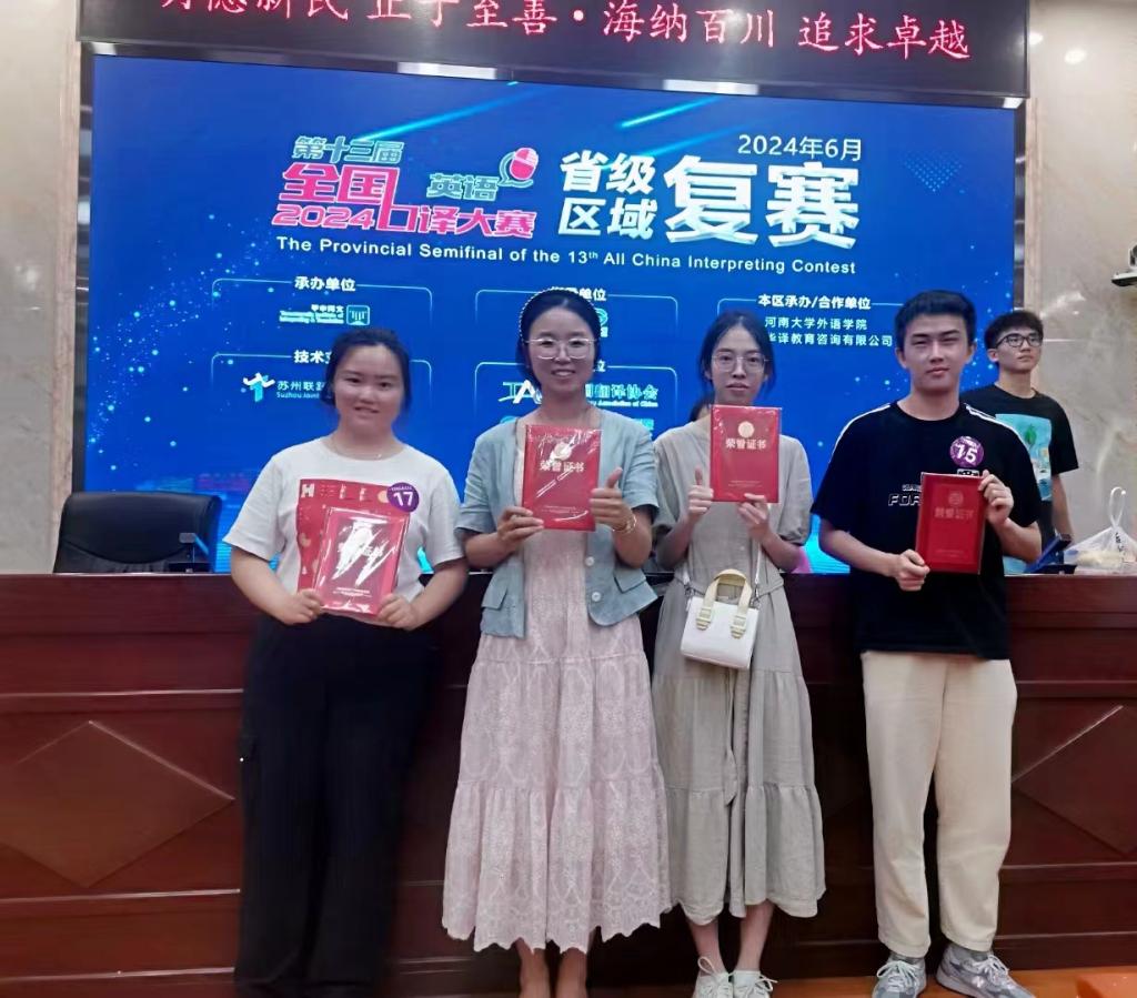 2024年6月26日,第十三届全国口译大赛河南省赛落下帷幕,我院MTI23级研究生沈珂和英语211班的刘俊颖同学均获河南省三等奖,英语211班的谢梦羽同学获河南省优秀奖。姚晓鸣、贺红艳两位老师荣获优秀口译指导教师奖。
