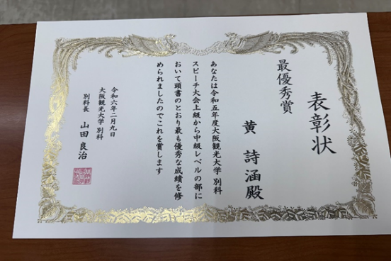 近日,我院海外交换生日语系黄诗涵同学,在日本大阪观光大学日语演讲比赛中,取得第一名。