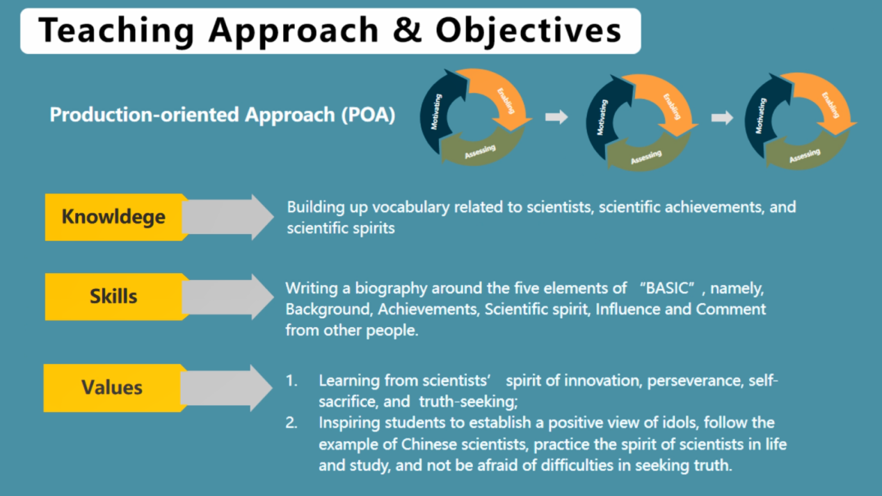全国高校外语教学大赛覆盖全国千余所高校,因其严谨、创新、公正、权威,位列全国外语类赛事首位。本次比赛由河南省高等教育学会外语教学研究分会、上海外语教育出版社联合协办,全省共32个微课团队提交了参赛作品,竞争激烈。我院教师团队精心选材,以《全新版大学英语综合教程(第三册)》第四单元“Imagination and Creativity”为思政教学点,运用产出导向法,阐释科学写作要素,启发学生树立积极正确的价值观、偶像观,引导学生以爱国科学家为榜样,践行科学家们所崇尚的执着专注、精益求精的工匠精神,涵养家国情怀,实现外语显性学习和课程隐性教育的有机统一。