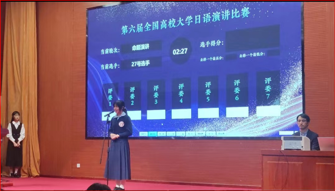 本赛事由教育部高等学校大学外语教学指导委员会日语组及高等学校大学外语教学研究会日语分会主办、北京语言大学东方语言文化学院承办、高等学校大学外语教学研究会日语分会理事单位高等教育出版社等协办。比赛面向全国各大高校非日语专业全日制本科生,旨在培养和激发全国高校学生对于日语学习的热情、提高各高校日语教学水平。我校陈洁同学与来自复旦大学、西安外国语大学、北京师范大学等35所高校的选手同台竞技,表现出色,沉着应战,取得了良好的成绩。