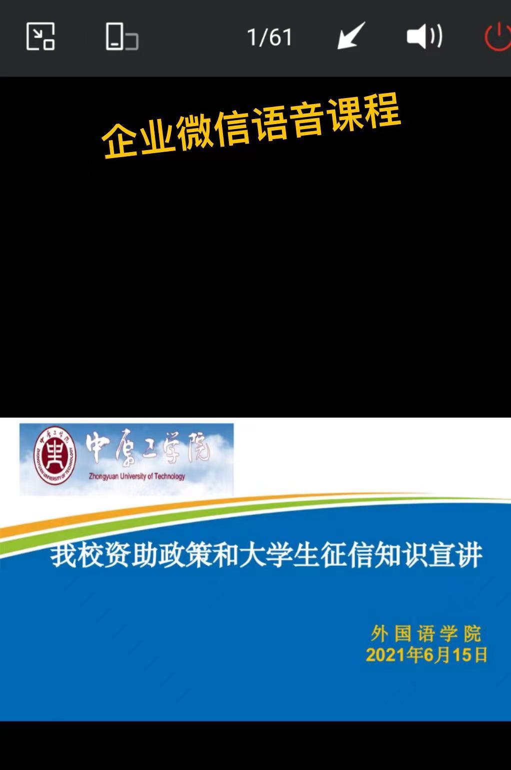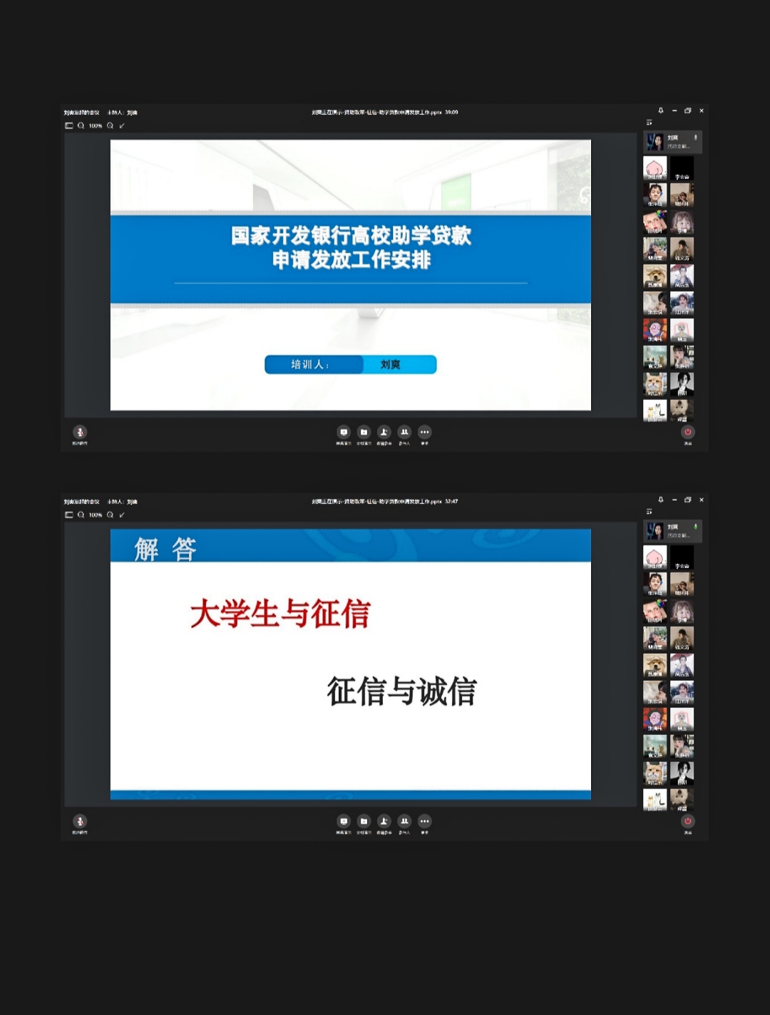 为深入贯彻落实习近平总书记关于教育的重要论述,推动我院诚信教育活动开展,普及相关贷款资助政策和相关征信知识,根据《关于做好2021年度国家开发银行高校助学贷款申请发放的工作通知》,我院于2021年6月17日下午14:00在企业微信平台成功开展了此次资助政策宣讲会。