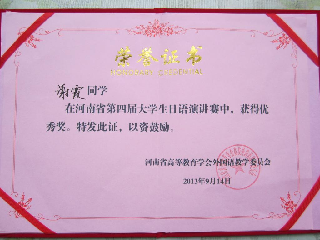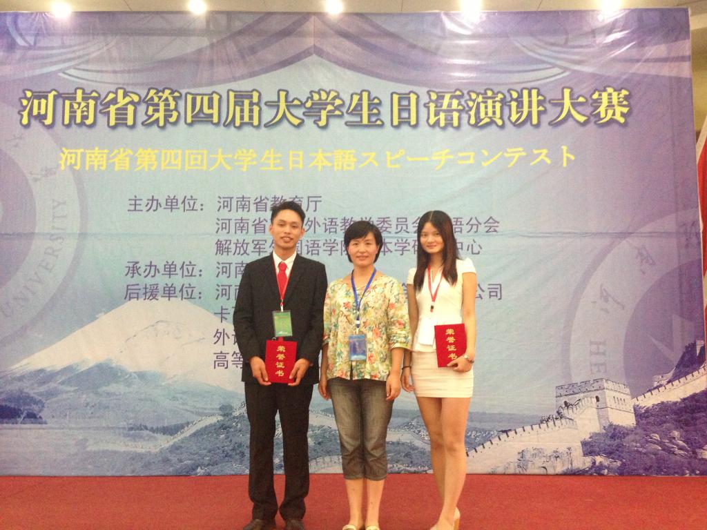 2013年9月14日,第四届河南省大学生日语演讲比赛在焦作成功举办,本次大赛由河南省教育厅及高等教育学会外国语教学委员会主办,河南理工大学承办,吸引了众多高校学生参赛。williamhill威廉希尔日语系10级学生谢霞和张建友同学代表学校参赛。大赛分为主题演讲和即兴演讲两个环节,上午的主题演讲环节各位选手旗鼓相当、难分伯仲,下午的即兴演讲环节将大赛推向了高潮。在带队老师于勇的悉心指导下,张建友和谢霞同学发挥稳定、表现突出,分获三等奖和优秀奖。