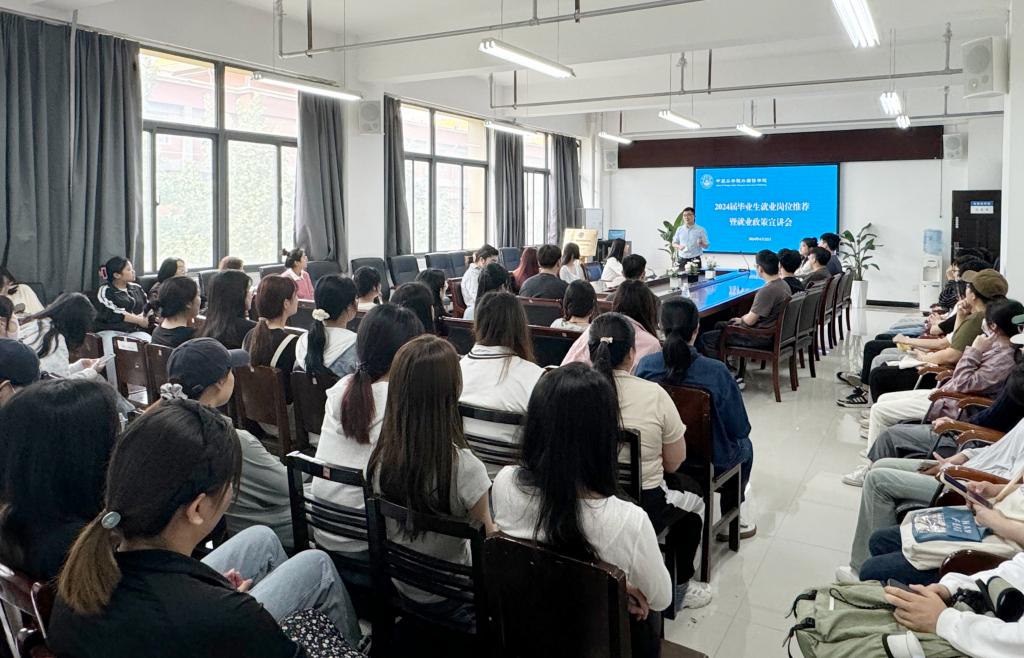 4月22日下午,我院组织2020级全体学生会议,为2024届毕业生集中推荐就业岗位,开展就业政策宣讲,党委副书记常潞炜、毕业生辅导员刘爽参加活动。
