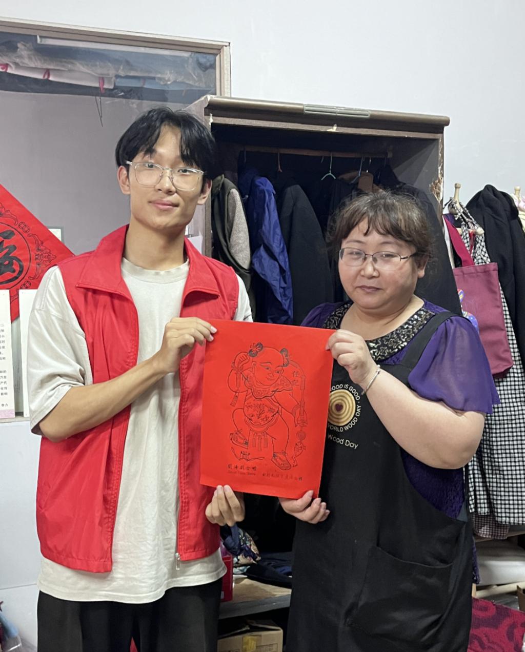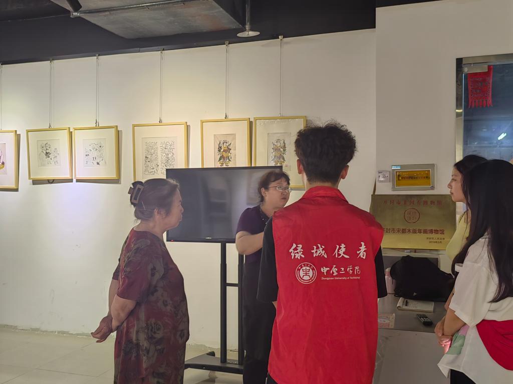 在本次活动中,学生团队前往了开封博物馆。在博物馆讲解员的带领下参观了木版年画展厅、石刻展厅以及汴绣展厅,学生们详细地了解到了各个展品的起源、发展历程、艺术特色及其制作工艺,全面地学习了非遗文化的丰富内涵。同时,学生代表们还前往了开封木版年画博物馆,与非遗传承人进行了互动交流,知晓了非遗技艺传承的现状和发展趋势。最后,在专业老师的指导下,学生代表们合作完成了一幅木版年画。