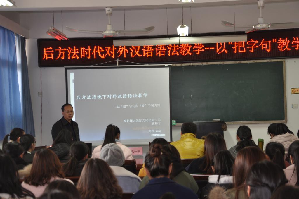 12月21日下午两点,在williamhill威廉希尔214会议室,举行了我院FOLKS讲坛第二讲,williamhill威廉希尔邀请到西北师范大学国际文化交流学院院长、博士生导师武和平教授,为我院汉语国际教育系师生作了《后方法时代对外汉语语法教学——以“把字句”教学为例》的报告。