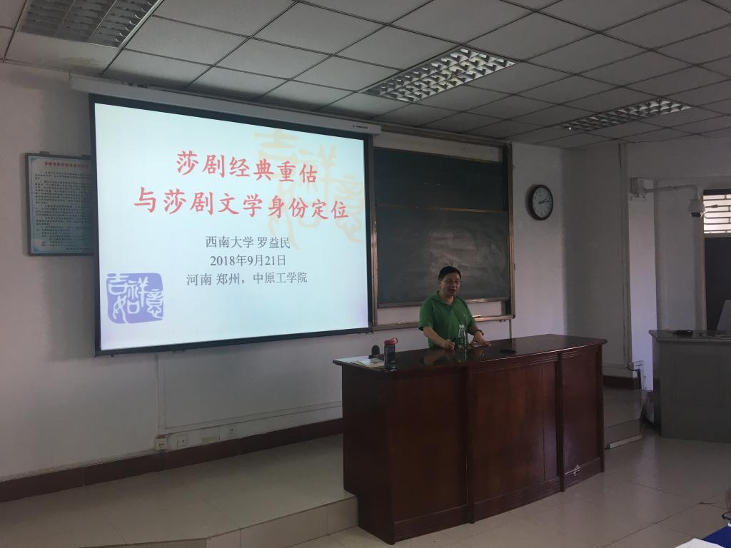 2018年9月21日下午,在龙湖校区4号楼301教室,举行了我校弘德讲坛暨我院FOLKS讲坛第六讲,邀请到西南大学博士生导师罗益民教授,讲座题目为《莎剧经典重估与莎剧文学身份定位》。罗益民教授是中国著名莎士比亚研究专家,著作等身,国家社科一般、重大课题等各级各类课题10余项,其中主持2项莎士比亚研究的国家社科基金项目。