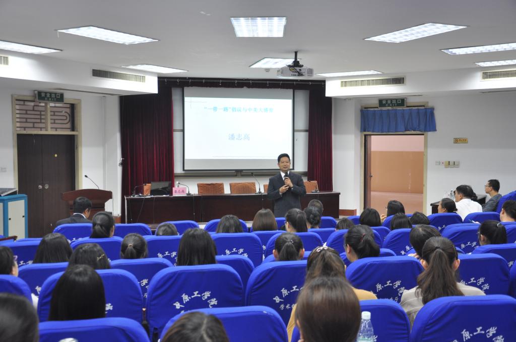 潘志高教授的讲座,从4月25日至27日于北京召开的第二届“一带一路”国际合作高峰论坛开始,介绍了本次高峰论坛的情况,阐释了习近平总书记有关“一带一路”的共商共建共享原则,开放、绿色、廉洁理念,高标准、惠民生、可持续目标,以及构建人类命运共同体的思想等。随后,分析了2013年“一带一路”倡议提出的背景,诸如2008年金融危机的余波未消,反全球化浪潮风起云涌,世界大国面临着艰巨的国内改革发展任务等“三期叠加”的国际环境;以及美国的亚太再平衡战略。最后,潘志高教授讲述了在新的国际形势下,“一带一路”倡议与我国外交战略的关系,以及说明“一带一路”是和平之路、繁荣之路、开放之路、创新之路、文明之路。期间,潘志高教授还对关键术语的翻译进行介绍,“一带一路”倡议为“Belt and Road Initiative”,“不冲突、不对抗、相互尊重、合作共赢”为“non-conflict, non-confrontation, mutual respect, and win-win cooperation”等。