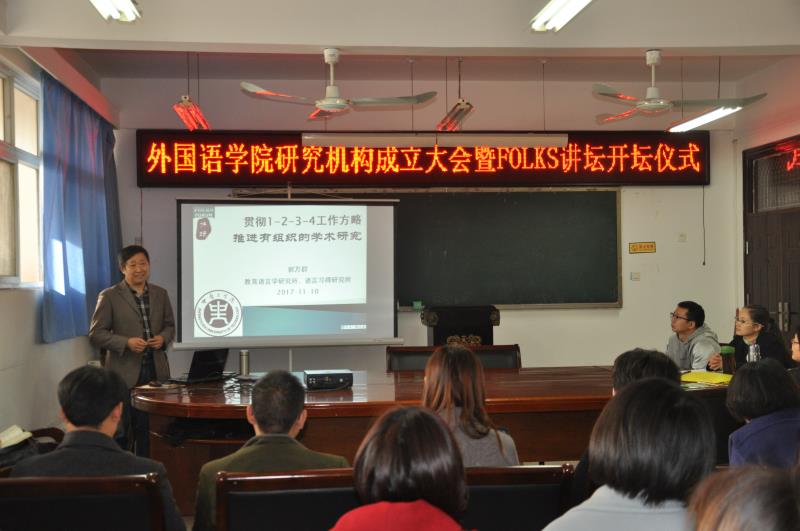 会议第二个议程,williamhill威廉希尔FOLKS讲坛开坛仪式,并由院长郭万群进行FOLKS讲坛开坛第一讲,讲座题目为《贯彻1-2-3-4工作方略推进有组织的学术研究》。FOLKS是校级研究机构“语言与传播研究所”英文首字母的简称,意涵在于团队合作与共享,彰显团队归属意识。FOLKS讲坛的启动,与各研究所的成立,将有利于营造学院的科研和学术氛围。院长郭万群的讲座深入浅出,结合自己多年的经验和感受,从“坚持‘一体化’道路”、“追求‘二元’价值”、“融汇‘三种’意识”、“促引‘四化’建设”等四个方面展开,在宏观与微观结合中,分享了如何有效且高效的进行学术研究,并且对研究所提出了具体的年度要求。