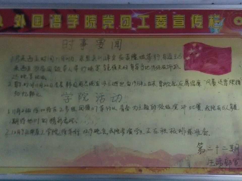 1. 11月23日18点将在2号组团楼117举行以青春为主题的校级演讲比赛,我院有五人参赛,期待他们的精彩表现。