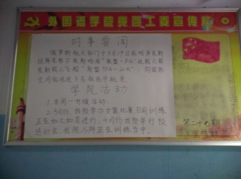 学院活动: 本周一举行升旗活动 3月份我校将举办女篮比赛,目前训练正如火如荼进行 4月份我校将举行校运动会,我院方阵正在训练中。
