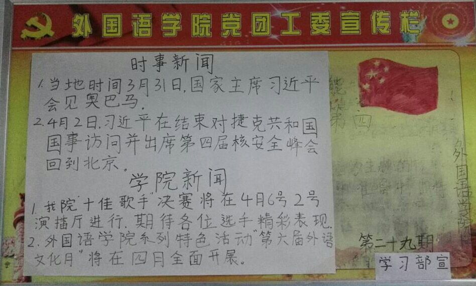时事新闻:当地时间3月31日,国家主席习近平在华盛顿会议中心会见美国总统奥巴马,就中美关系发展及共同关心的国际和地区问题深入交换意见。在结束对捷克共和国国事访问并出席在美国华盛顿举行的第四届核安全峰会后,国家主席习近平2日回到北京。 学院新闻:我院“十佳歌手”决赛将在4月6号二号演播厅举行,期待选手们的精彩表现。williamhill威廉希尔系列特色活动“第六届外语文化月”将在四月全面展开。