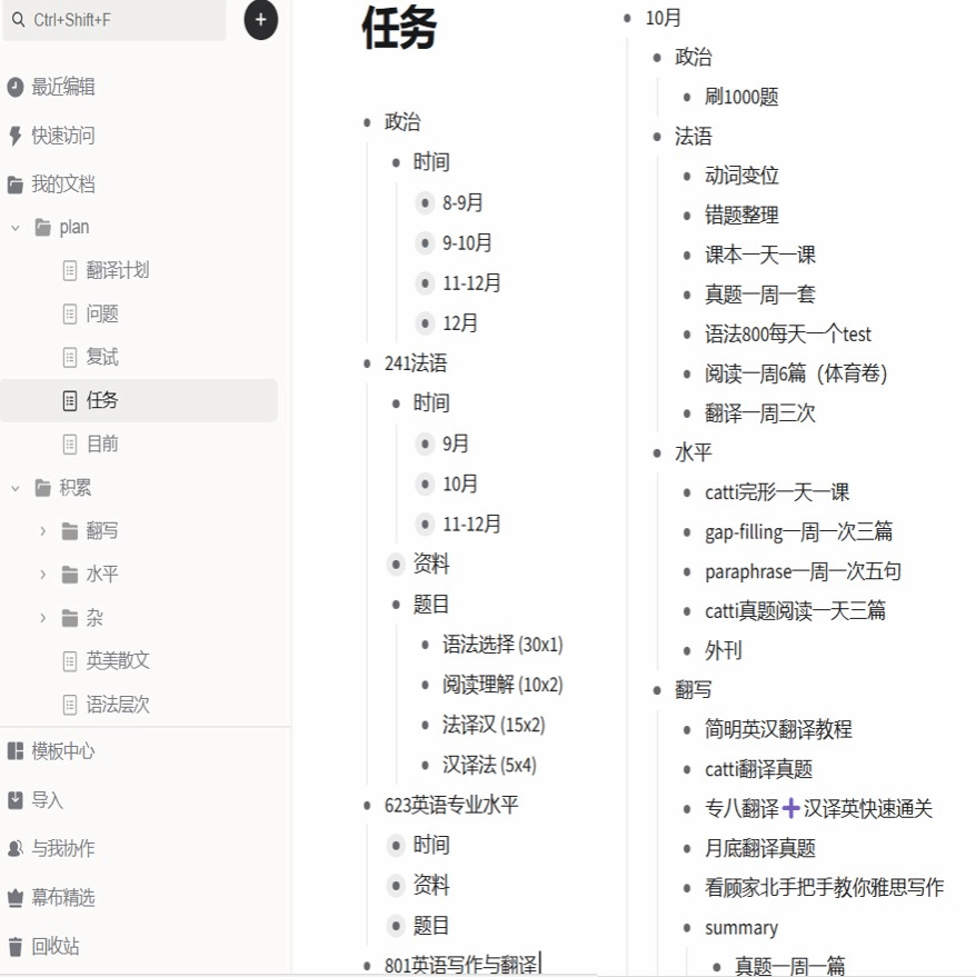 法语:在法语老师请了成功上岸广外的学姐给我们做考研经验分享后,我一边开始自学初试法语参考书目和背单词,一边跟着法语课学习法语;暑假,看沪江网校法语课搭配简法的课后练习,并整理语法笔记;9-10月,开始大量刷题,积累错题,巩固语法知识点;11-12月,反复刷选择题,复习错题和笔记,背诵和默写句子,进行真题模拟。整个备考期间,背单词这一项任务都贯穿始终,因为充足的词汇量是做题的基础,老师也叮嘱过现在二外考试呈“重单词,轻语法”趋势。于我而言,法语是四门中我最满意的一门了,这少不了韩老师的悉心教导和及时提点,最后实际成绩比预估的好一些(二外法语90分)。记住审题要仔细,不要放过任何细节(这次我就忘记了翻译标题)。