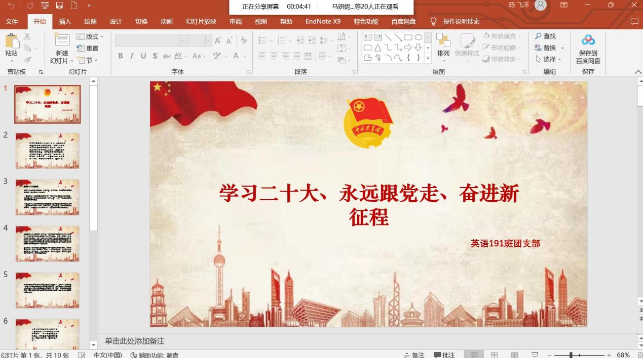 2019级团支部因毕业、就业等原因通过线上会议方式集中学习,同学们深入学习党的二十大对全面建设社会主义现代化国家作出的战略安排,深刻领悟“两个确立”的决定性意义,加深了对“习近平新时代中国特色社会主义思想”、“马克思主义中国化时代化”、“中国式现代化”等重要理念的认识。