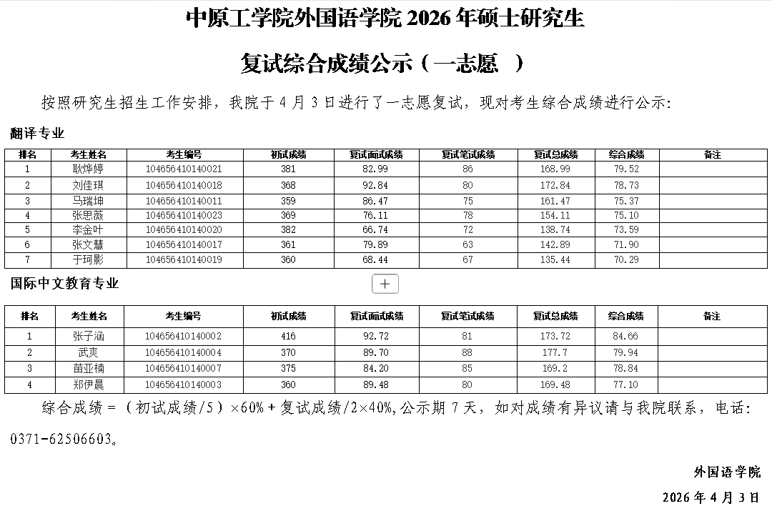 williamhill威廉希尔2026年硕士研究生 复试综合成绩公示(一志愿 )